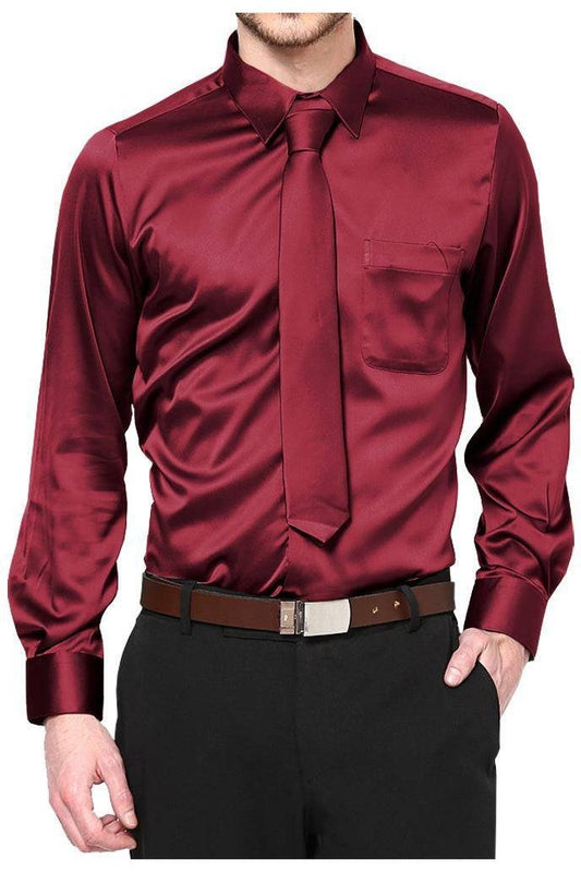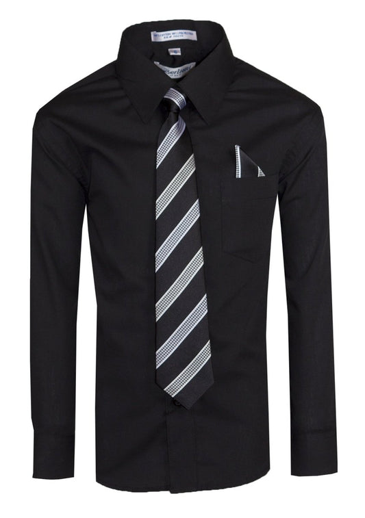 Camisa de vestir de manga larga de satén para niños con corbata y pañuelo de bolsillo