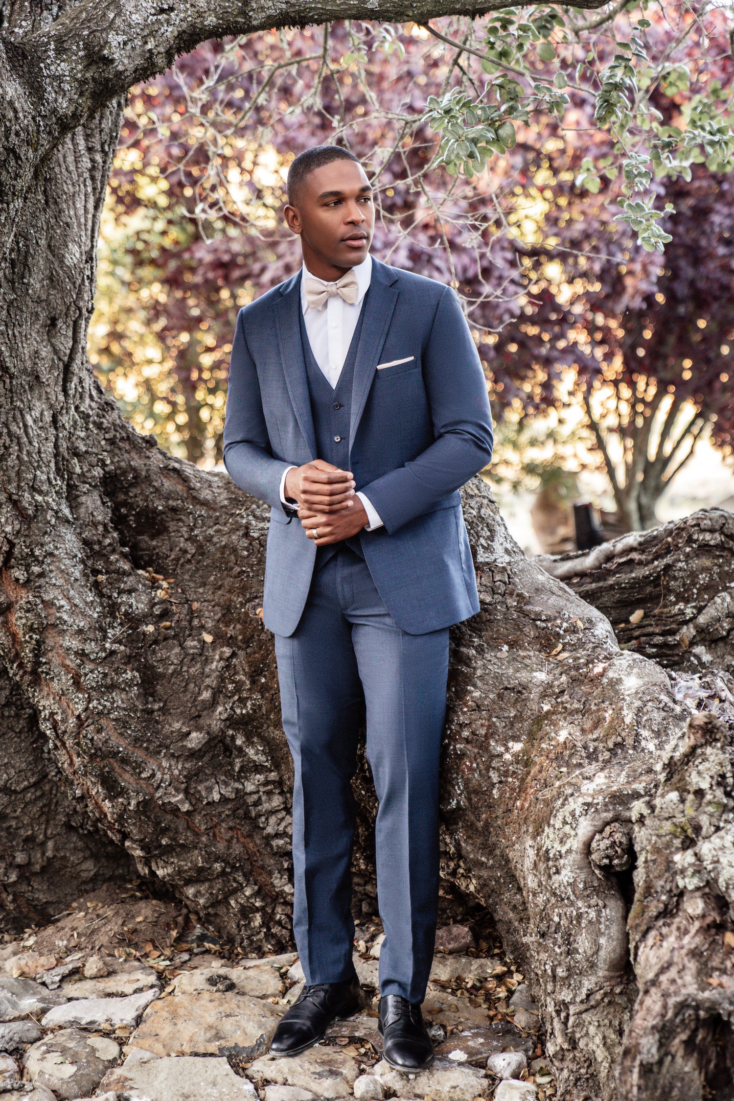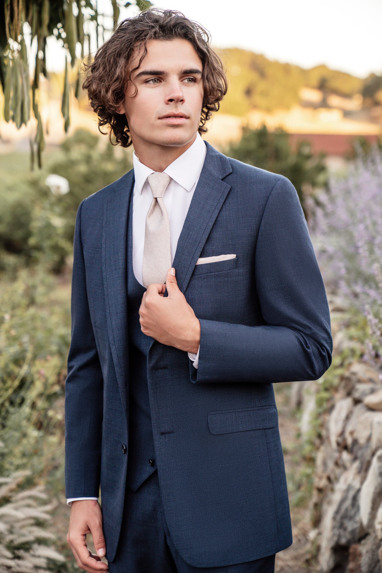 Allure Bridal "The Ridge" Slim Fit Denim Blue Three-Piece Suit isn't for blending in. With its warm tone and sharp modern silhouette, this suit makes a statement the moment you walk through the door — whether that's down the aisle, onto the dance floor, or into the room.